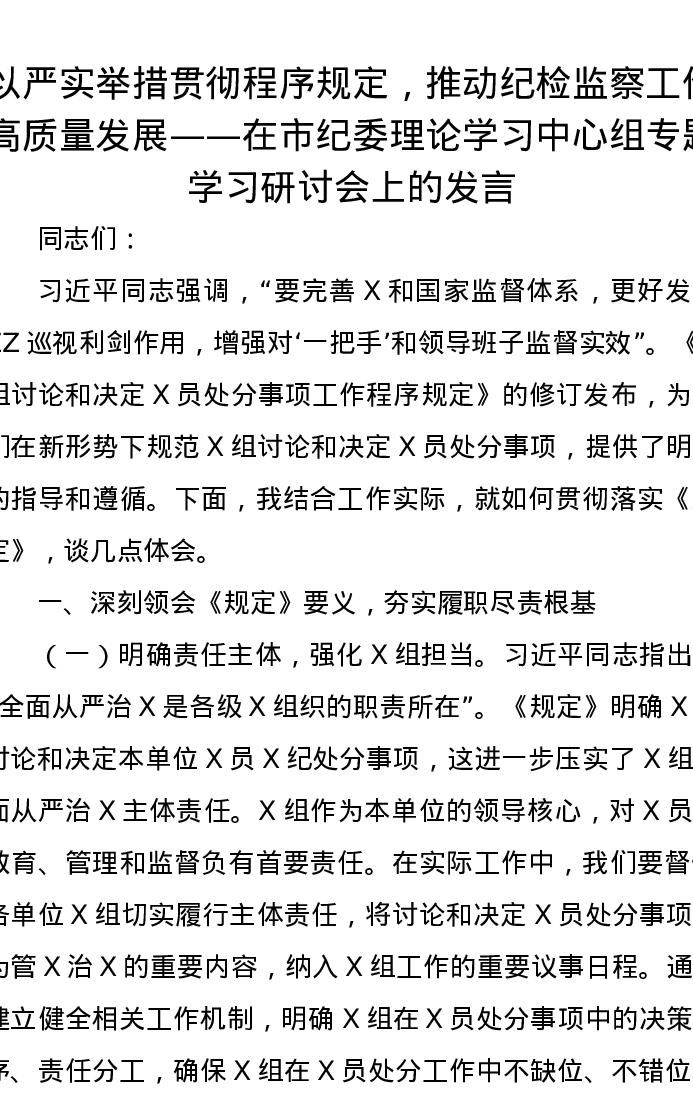 以严实举措贯彻程序规定,推动纪检监察工作高质量发展——在市纪委理论学习中心组专题学习研讨会上的发言