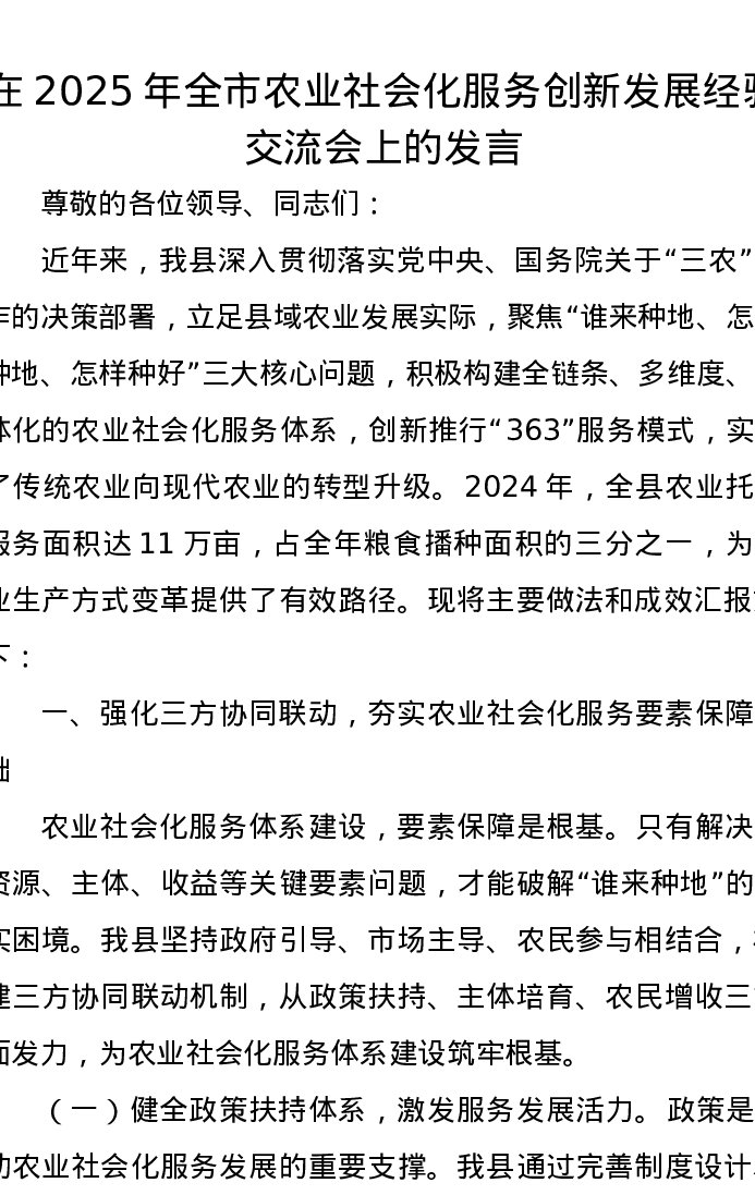 在2025年全市农业社会化服务创新发展经验交流会上的发言