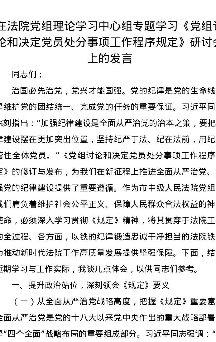 在法院党组理论学习中心组专题学习《党组讨论和决定党员处分事项工作程序规定》研讨会上的发言
