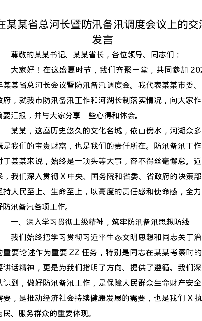 在某某省总河长暨防汛备汛调度会议上的交流发言
