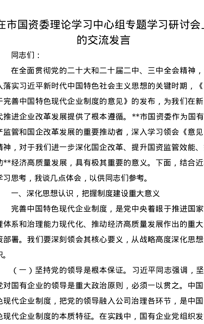 在市国资委理论学习中心组专题学习研讨会上的交流发言