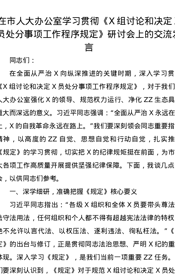 在市人大办公室学习贯彻《党组讨论和决定党员处分事项工作程序规定》研讨会上的交流发言