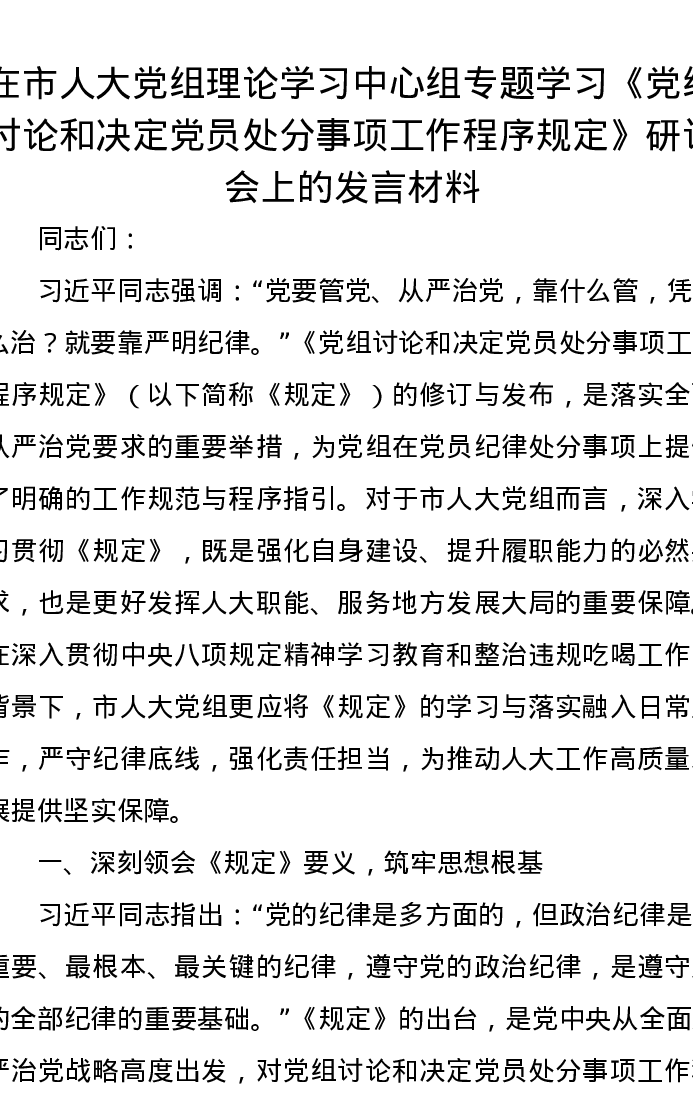 在市人大党组理论学习中心组专题学习《党组讨论和决定党员处分事项工作程序规定》研讨会上的发言材料