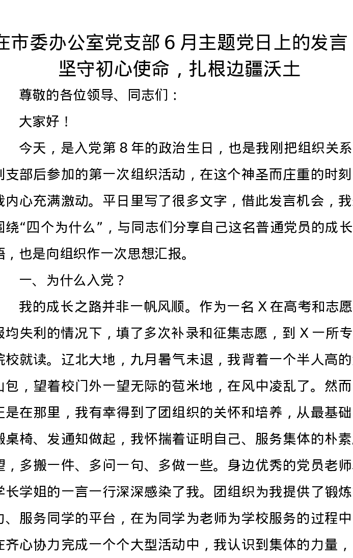 在市委办公室党支部6月主题党日上的发言:坚守初心使命,扎根边疆沃土