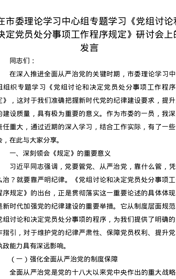 在市委理论学习中心组专题学习《党组讨论和决定党员处分事项工作程序规定》研讨会上的发言