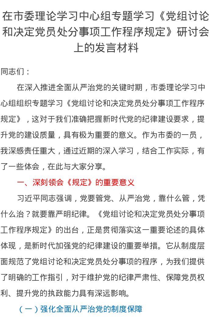 在市委理论学习中心组专题学习《党组讨论和决定党员处分事项工作程序规定》研讨会上的发言材料