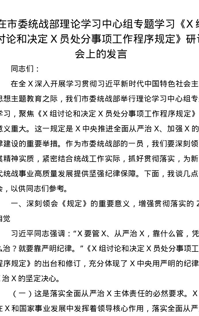 在市委统战部理论学习中心组专题学习《党组讨论和决定党员处分事项工作程序规定》研讨会上的发言
