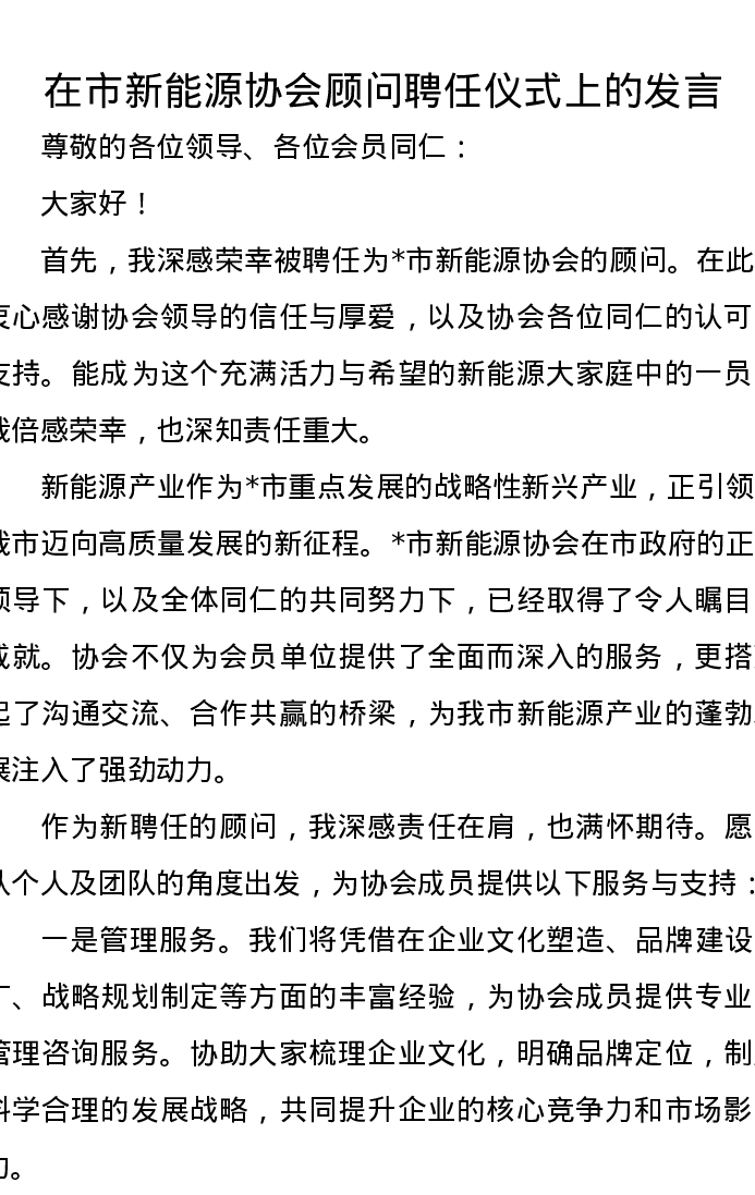 在市新能源协会顾问聘任仪式上的发言