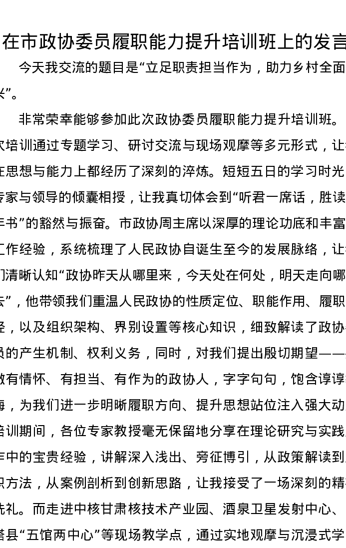 在市政协委员履职能力提升培训班上的发言