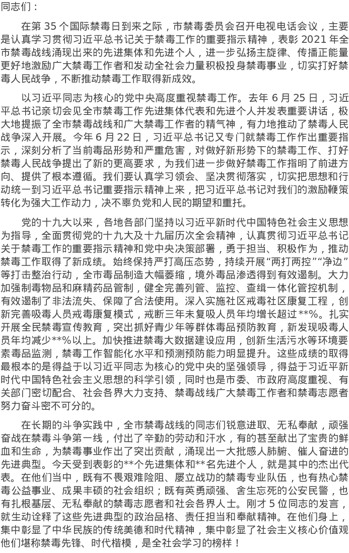 20220627在2022年全市禁毒工作先进集体和先进个人表彰会议上的讲话