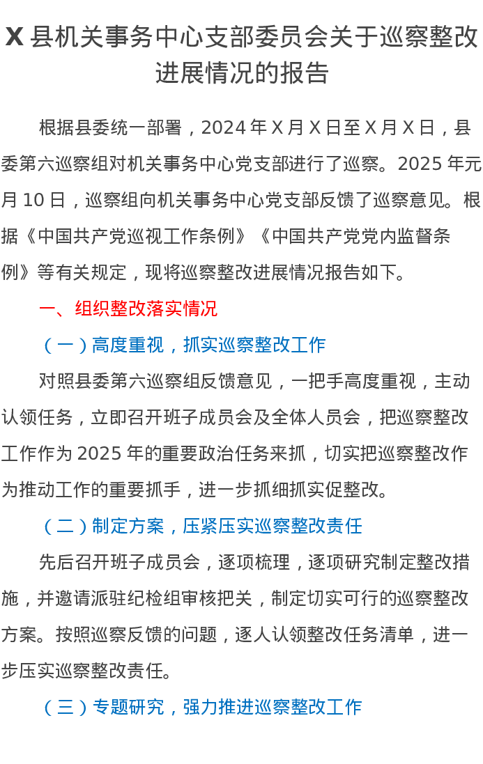 X县机关事务中心支部委员会关于巡察整改进展情况的报告