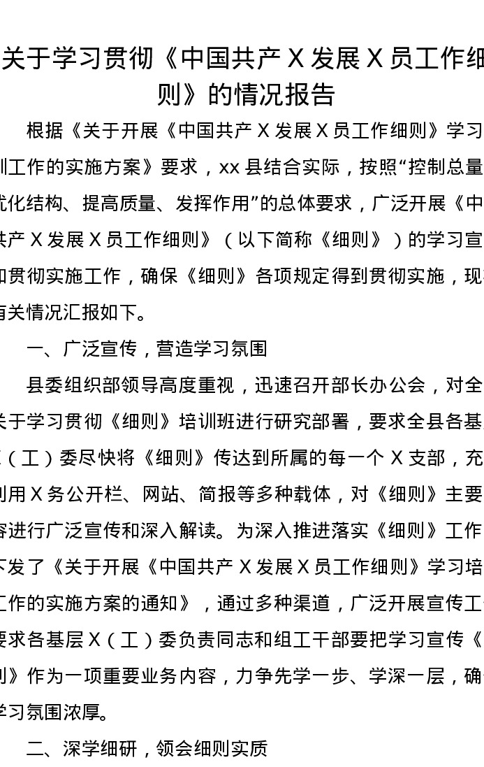 关于学习贯彻《中国共产党发展党员工作细则》的情况报告