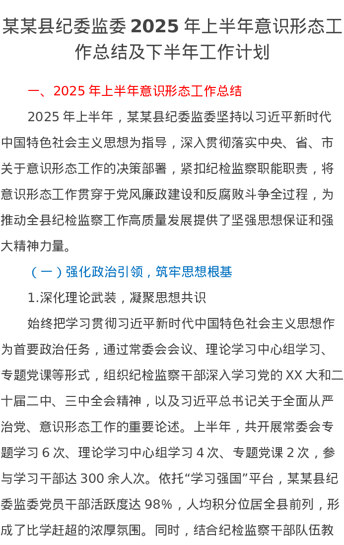 某某县纪委监委2025年上半年意识形态工作总结及下半年工作计划