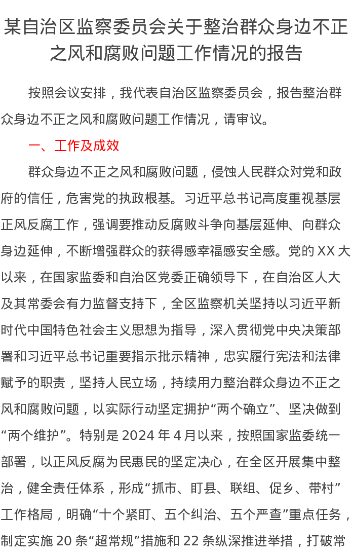 某自治区监察委员会关于整治群众身边不正之风和腐败问题工作情况的报告
