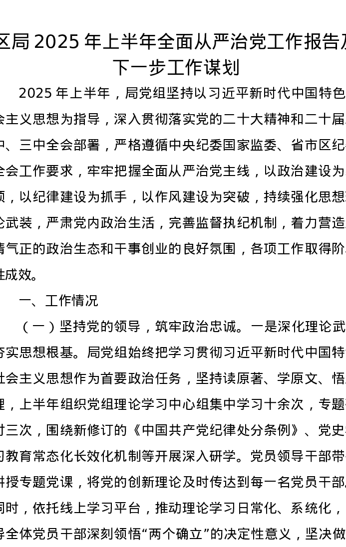 区局2025年上半年全面从严治党工作报告及下一步工作谋划