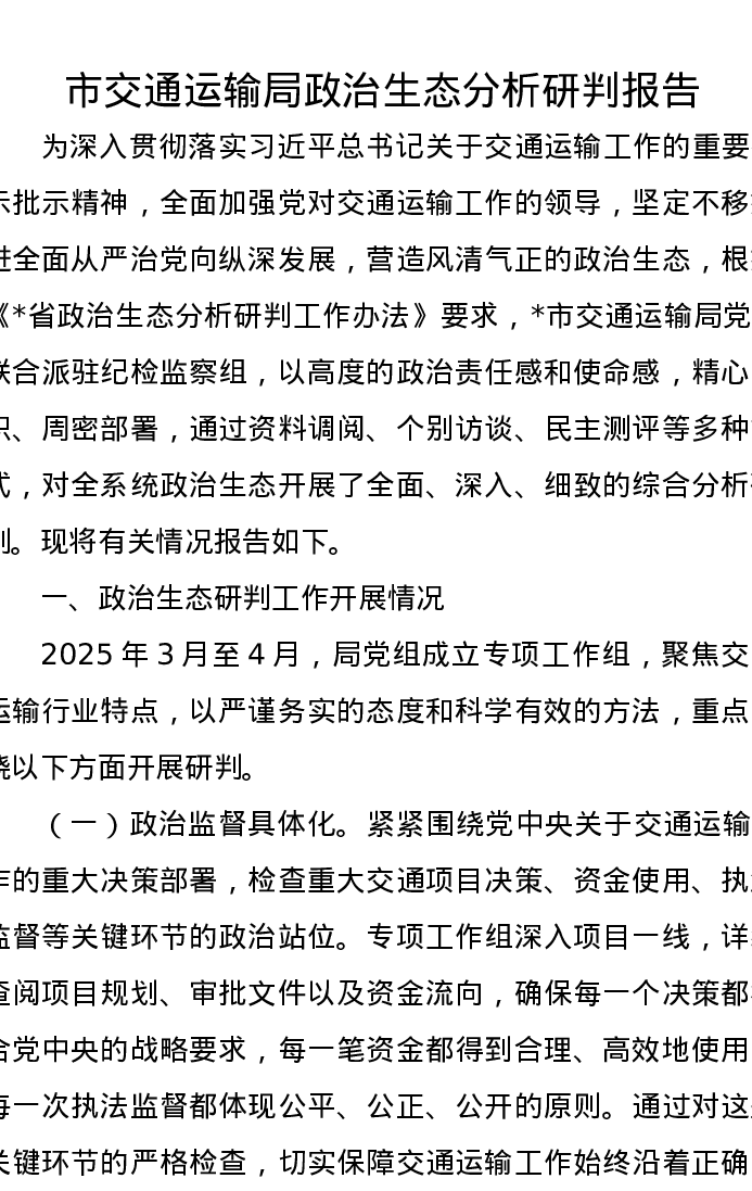 市交通运输局政治生态分析研判报告