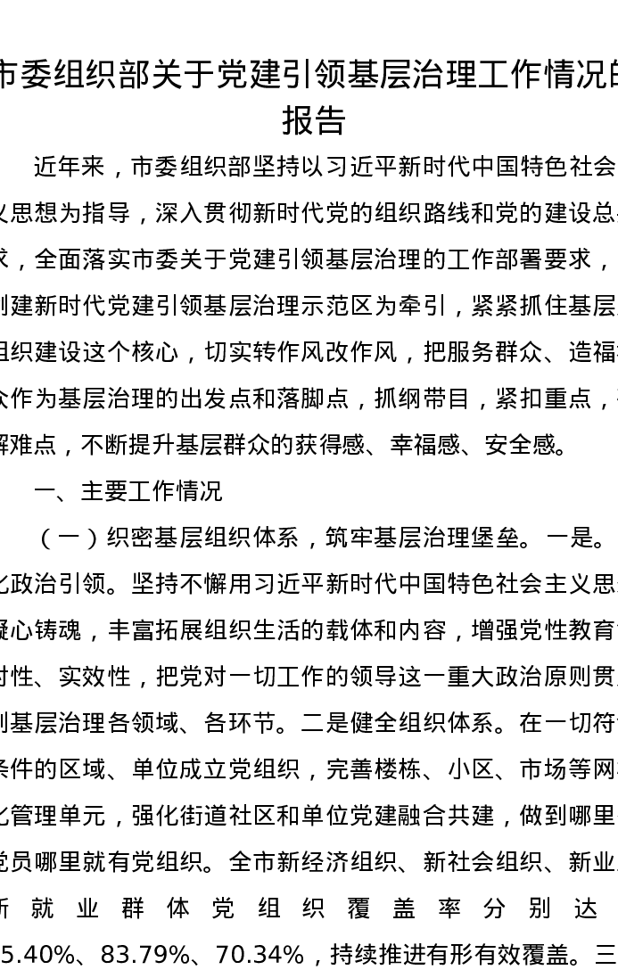 市委组织部关于党建引领基层治理工作情况的报告