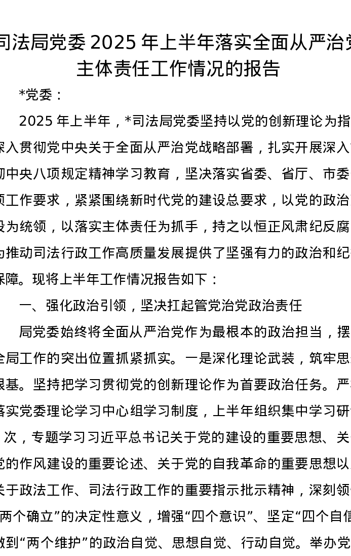司法局党委2025年上半年落实全面从严治党主体责任工作情况的报告