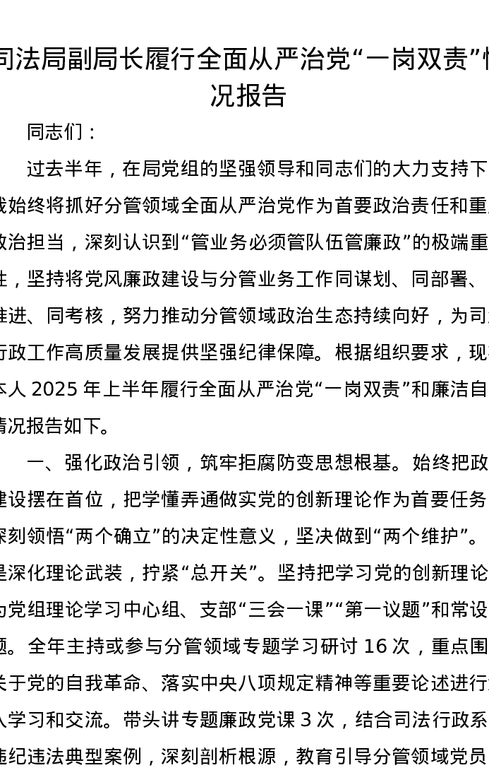 司法局副局长履行全面从严治党“一岗双责”情况报告