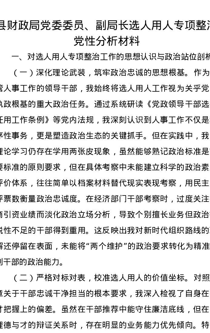 县财政局党委委员、副局长选人用人专项整治党性分析报告材料