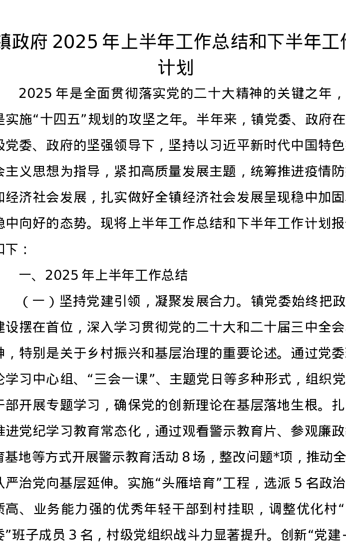 镇政府2025年上半年工作总结和下半年工作计划