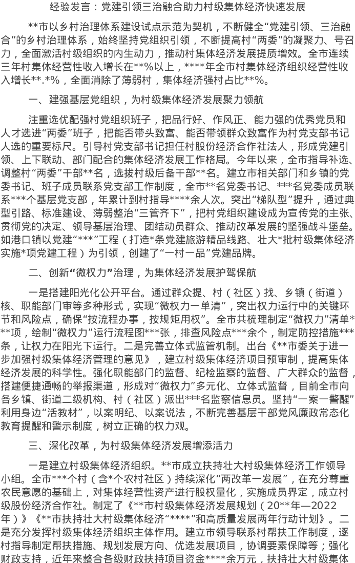 20220719经验发言:党建引领三治融合助力村级集体经济快速发展