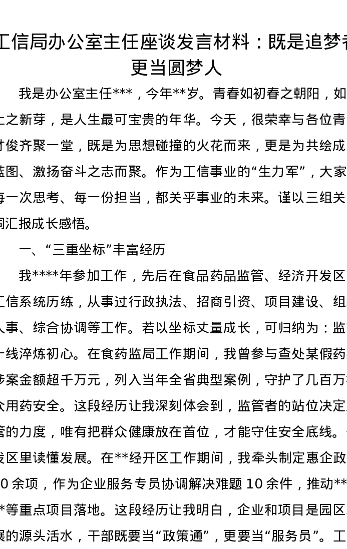 工信局办公室主任座谈发言材料:既是追梦者 更当圆梦人