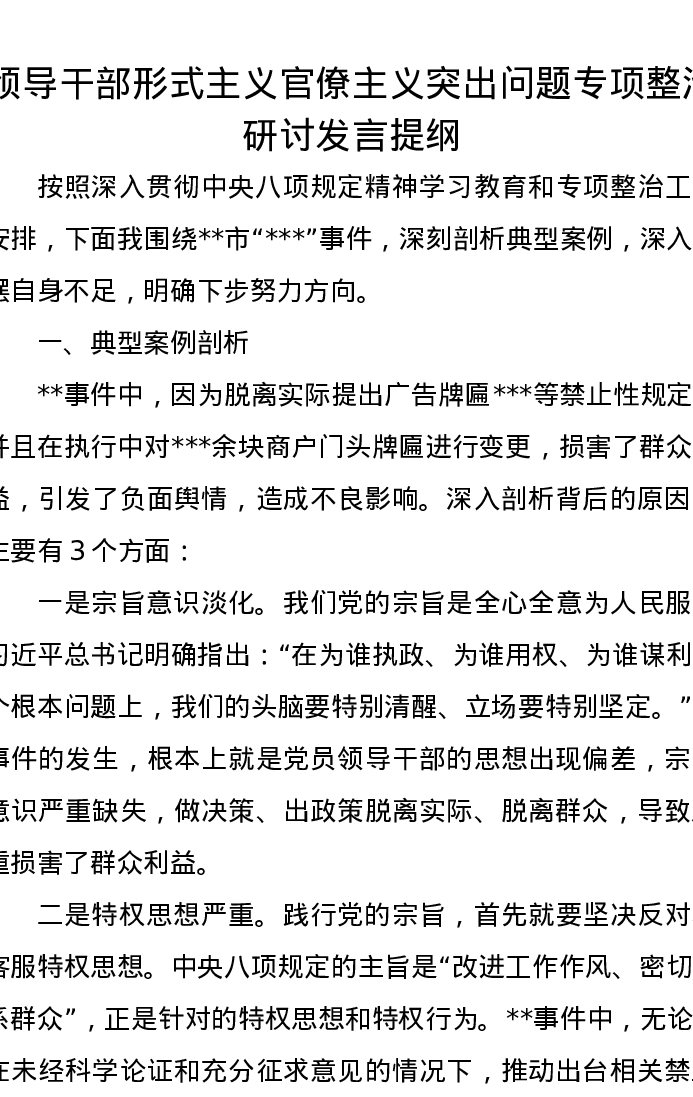 领导干部形式主义官僚主义突出问题专项整治研讨发言提纲