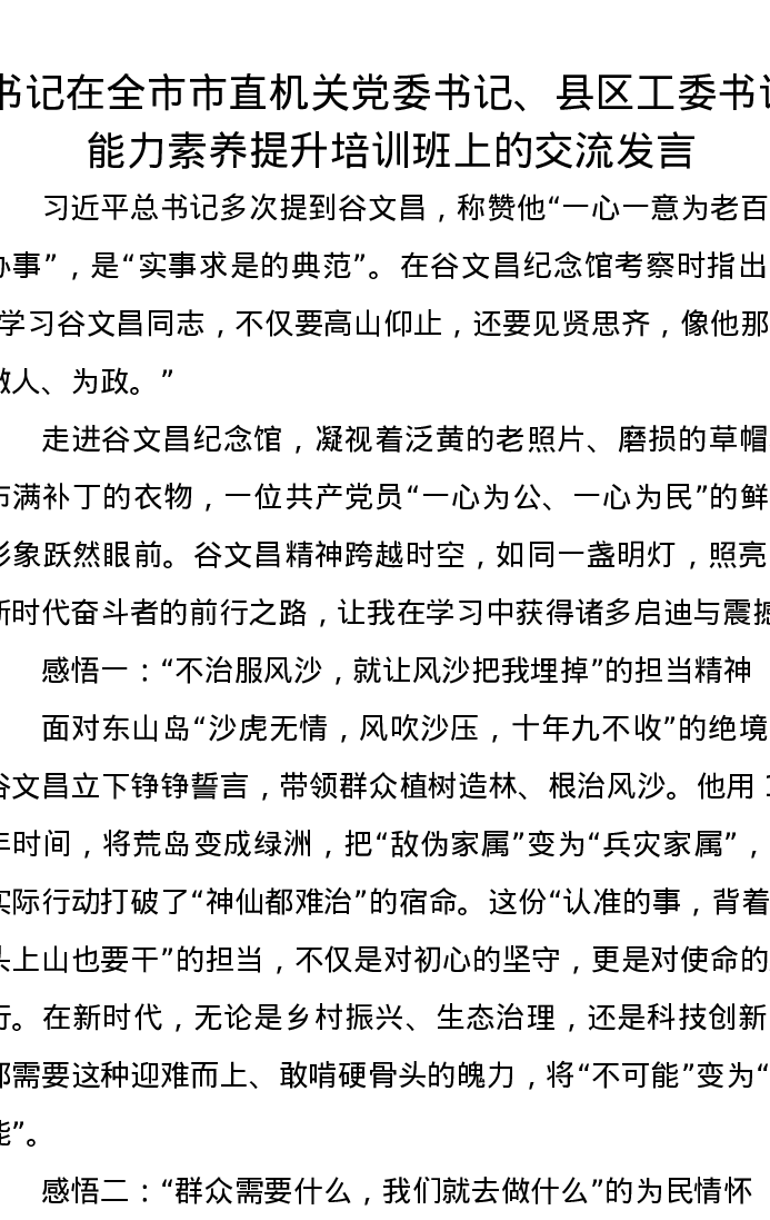 书记在全市市直机关党委书记、县区工委书记能力素养提升培训班上的交流发言