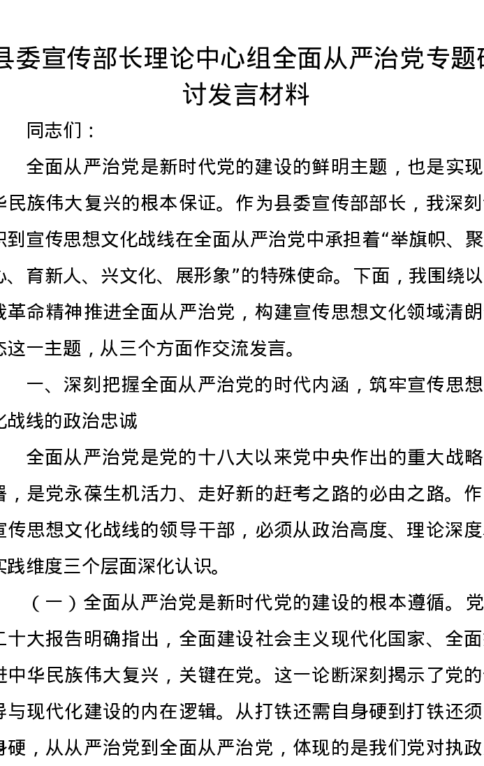 县委宣传部长理论中心组全面从严治党专题研讨发言材料