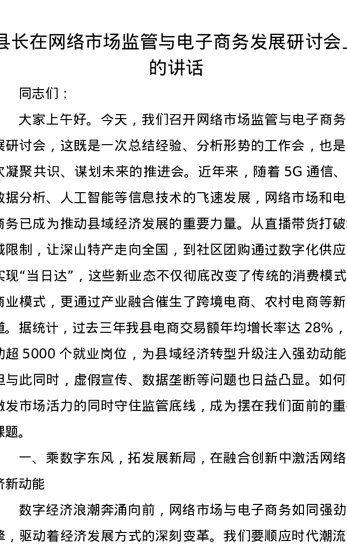 县长在网络市场监管与电子商务发展研讨会上的讲话