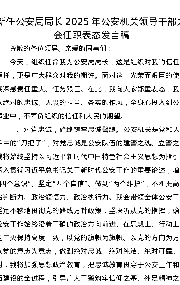 新任公安局局长2025年公安机关领导干部大会任职表态发言稿