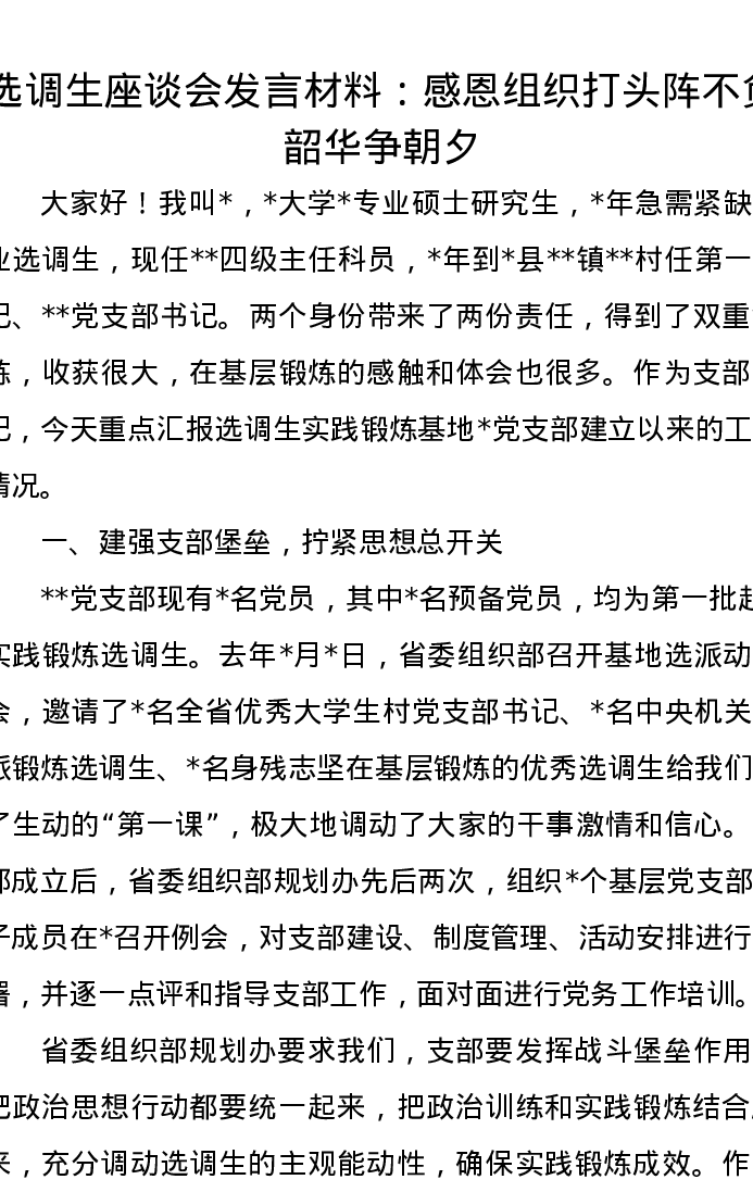 选调生座谈会发言材料:感恩组织打头阵 不负韶华争朝夕