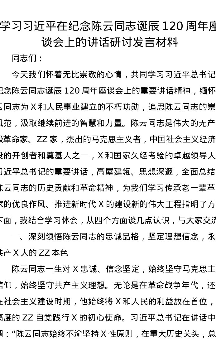 学习习近平在纪念陈云同志诞辰120周年座谈会上的讲话研讨发言材料