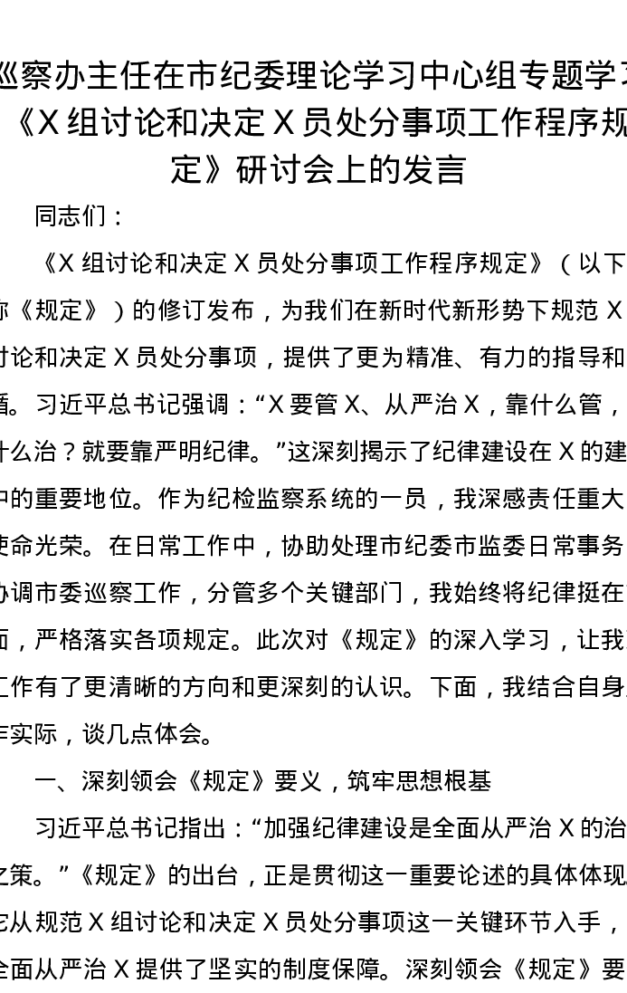 巡察办主任在市纪委理论学习中心组专题学习《党组讨论和决定党员处分事项工作程序规定》研讨会上的发言