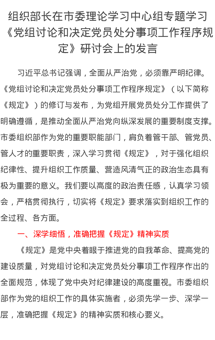 组织部长在市委理论学习中心组专题学习《党组讨论和决定党员处分事项工作程序规定》研讨会上的发言