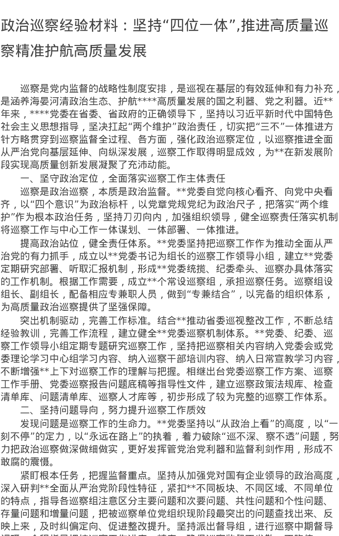 20220727政治巡察经验材料:坚持“四位一体”,推进高质量巡察精准护航高质量发展