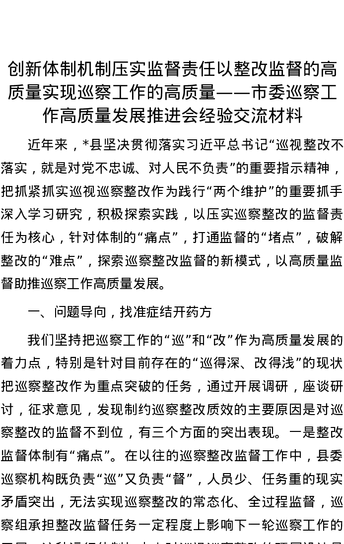 20220816创新体制机制 压实监督责任 以整改监督的高质量实现巡察工作的高质量——市委巡察工作高质量发展推进会经验交流材料