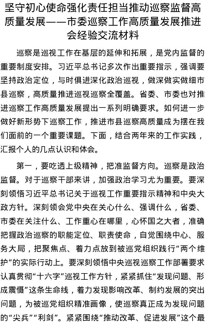 20220816坚守初心使命 强化责任担当 推动巡察监督高质量发展——市委巡察工作高质量发展推进会经验交流材料