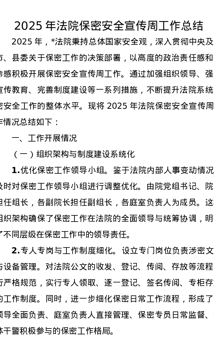2025年法院保密安全宣传周工作总结