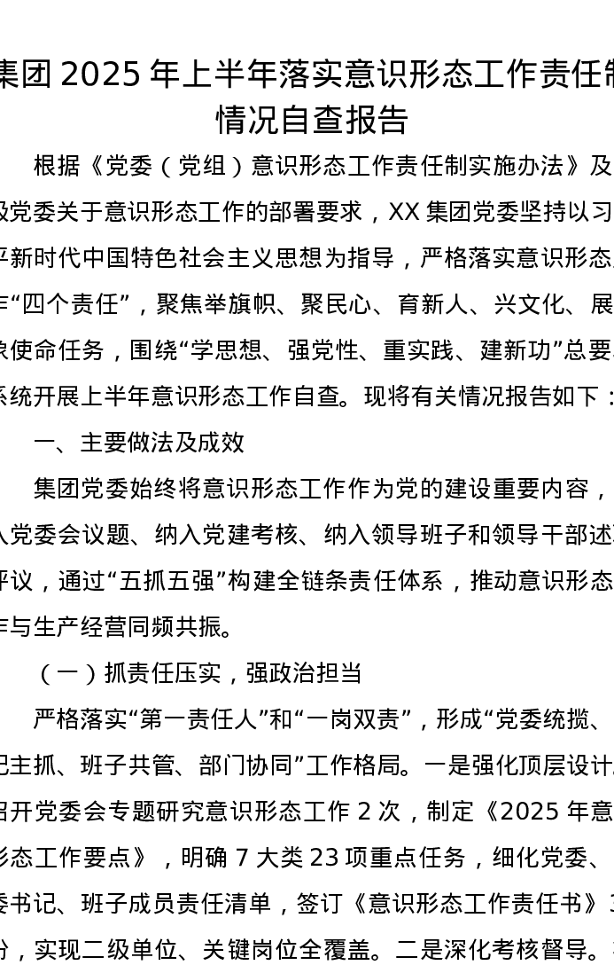 集团2025年上半年落实意识形态工作责任制情况自查报告