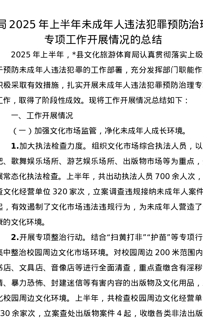 局2025年上半年未成年人违法犯罪预防治理专项工作开展情况的总结