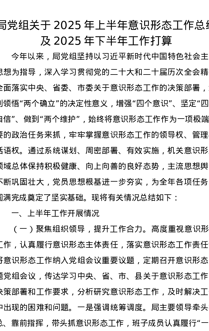 局党组关于2025年上半年意识形态工作总结及2025年下半年工作打算