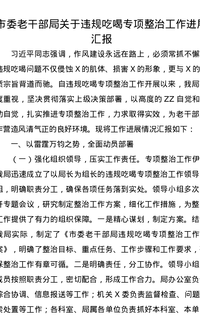 市委老干部局关于违规吃喝专项整治工作进展汇报