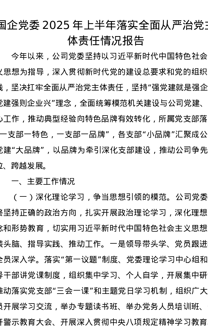 国企党委2025年上半年落实全面从严治党主体责任情况报告
