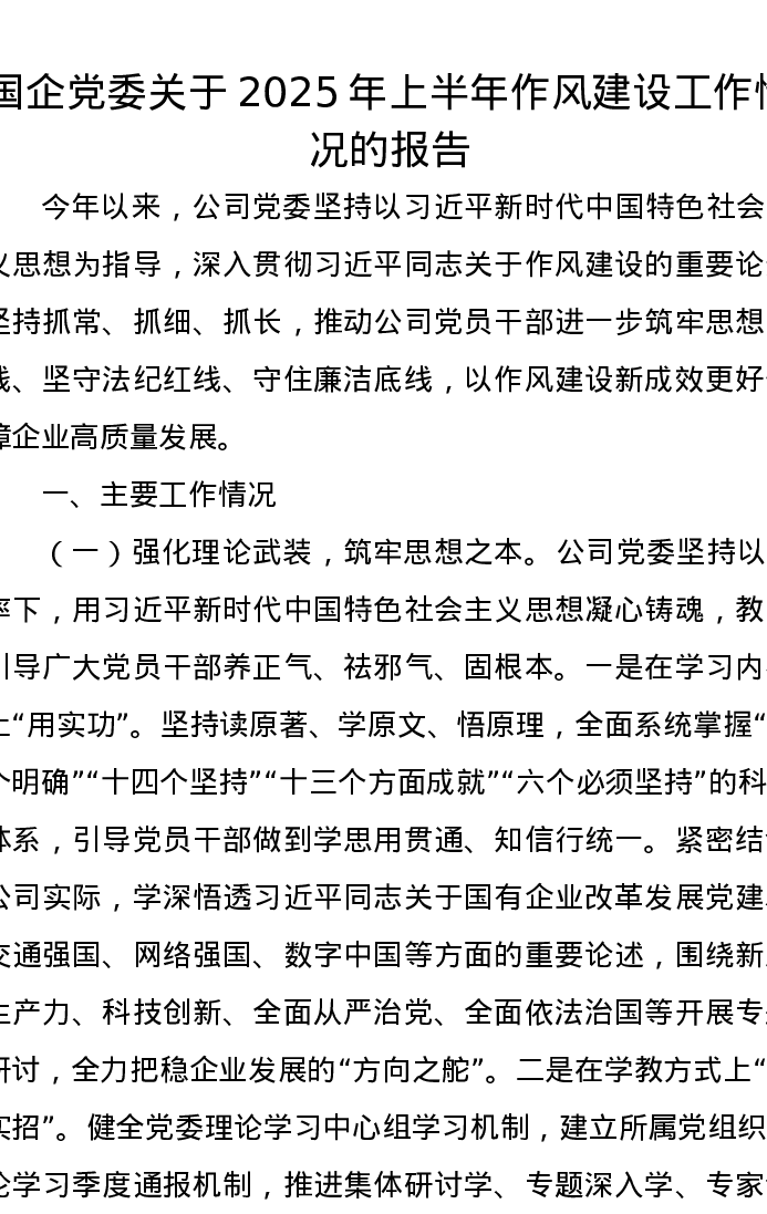 国企党委关于2025年上半年作风建设工作情况的报告