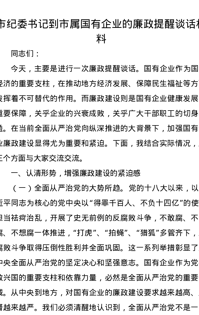 市纪委书记到市属国有企业的廉政提醒谈话材料