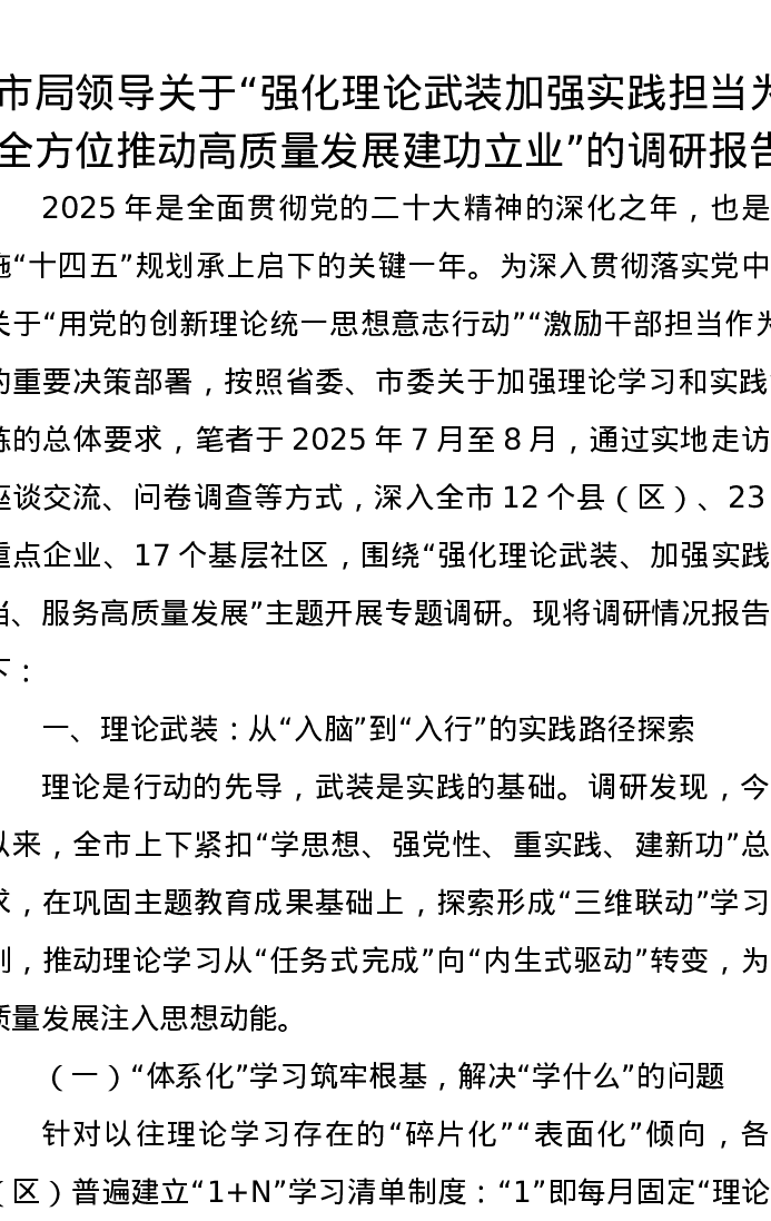 市局领导关于“强化理论武装加强实践担当为全方位推动高质量发展建功立业”的调研报告