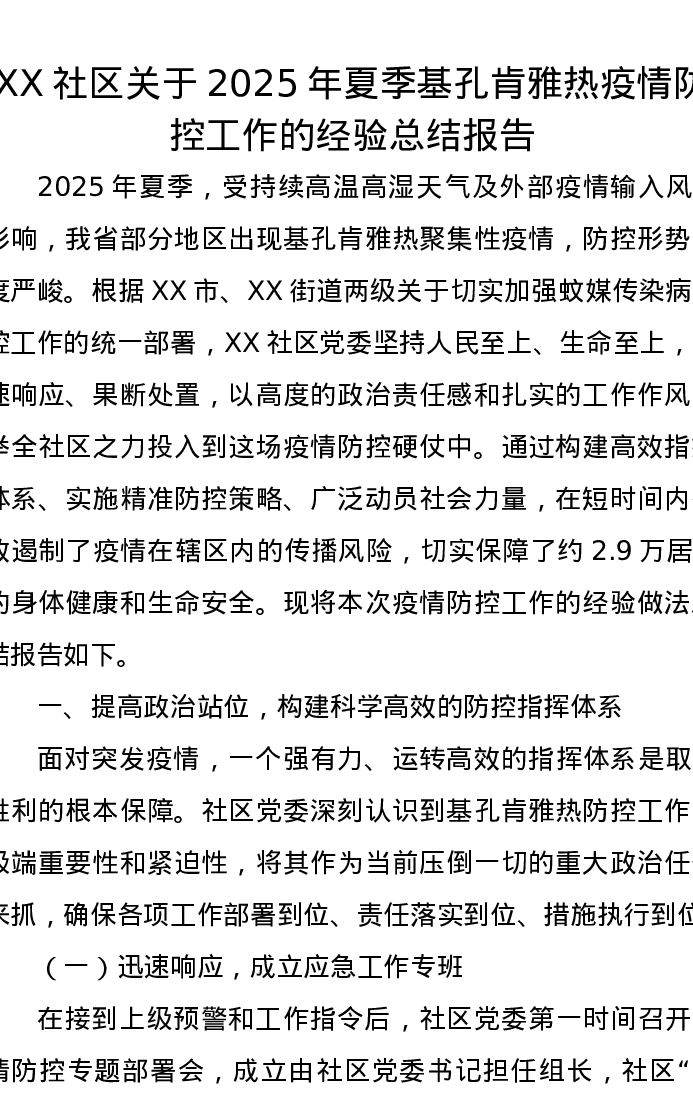 XX社区关于2025年夏季基孔肯雅热疫情防控工作的经验总结报告
