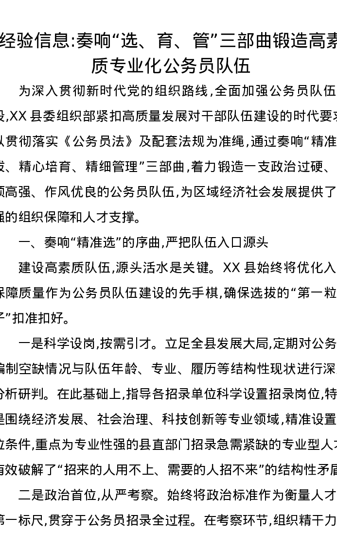 经验信息:奏响“选、育、管”三部曲锻造高素质专业化公务员队伍